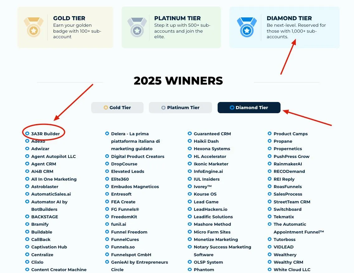 E para se ter uma ideia, fomos premiados com o maior prêmio da GoHighlevel, que é o Diamond, por ter um altíssimo número de contas vendidas através da nossa própria conta da GHL (o 3A3R Builder). Junto com grandes nomes de marketing digital no MUNDO por dois anos seguidos: